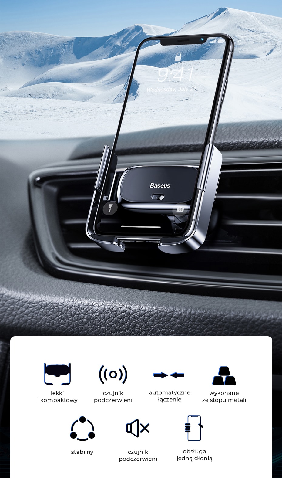 Insert the phone into the holder and the inductive sensor will automatically clamp the arms of the device. Pressing the button on the top of the main panel will make the handles loose and the phone is released. A simple and quick solution that allows you to use the device with one hand. With the electric Baseus holder you are able to focus on driving and get rid of the problems with putting your smartphone in the right place.