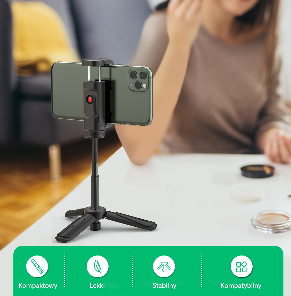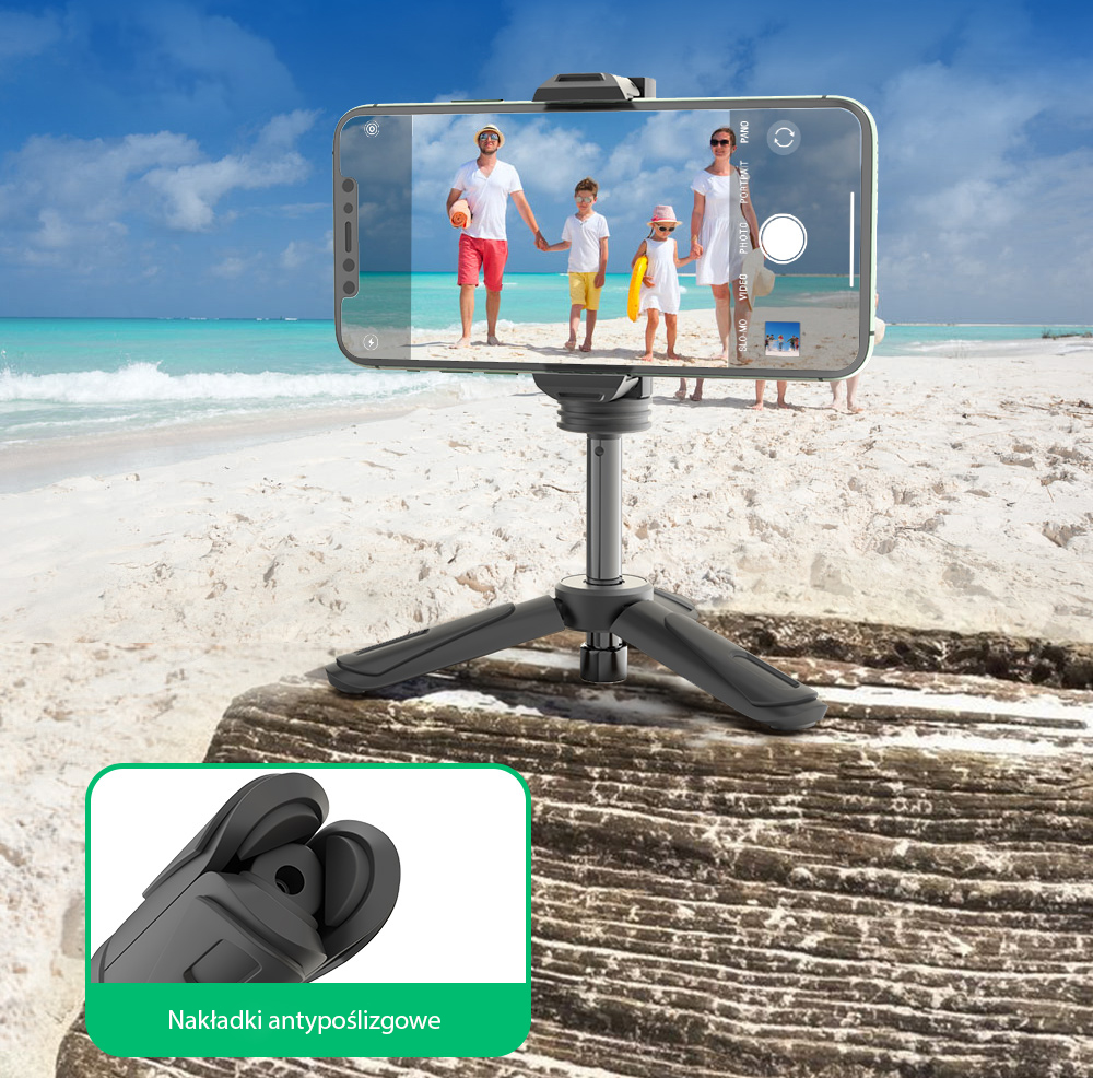 Portable, non-removable selfie stick with a tripod. Perfect for both smartphones and sports cameras. A 1/4" screw, retractable tripod and a phone holder make it a universal gadget for taking pictures and filming.