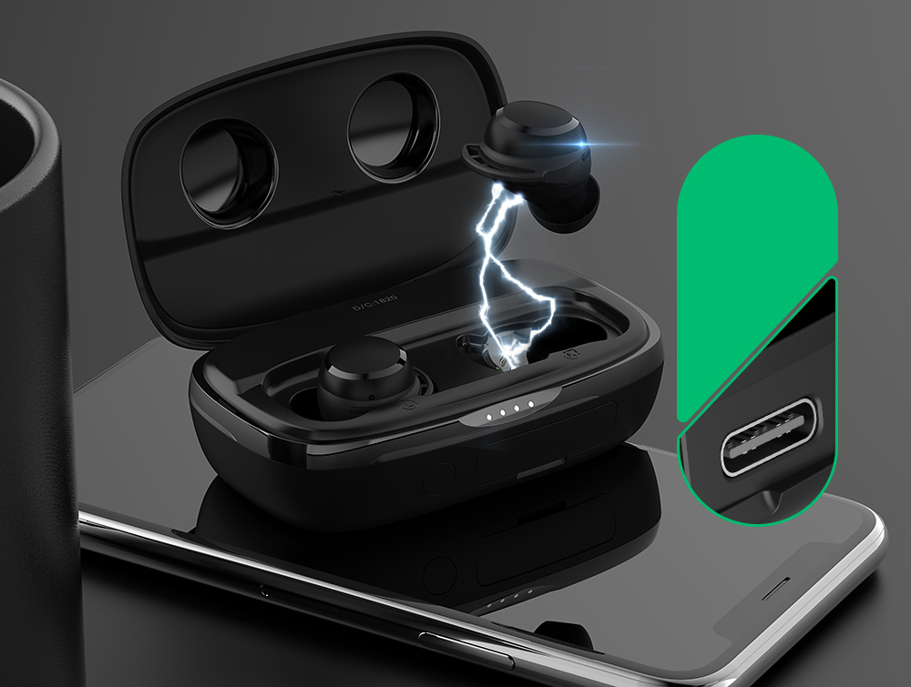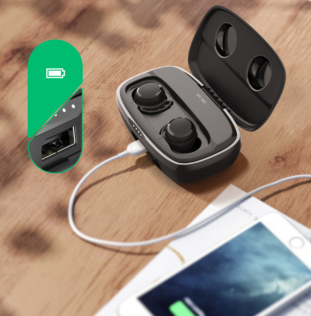 The headset container is also its charger with an increased battery capacity of 2000mAh/3.7V. This provides 3 hours of continuous music playback and 2.5 to 3 hours of telephone conversation. Unused, charged headphones will last up to 70 hours. The case can be used as a powerbank for your phone.