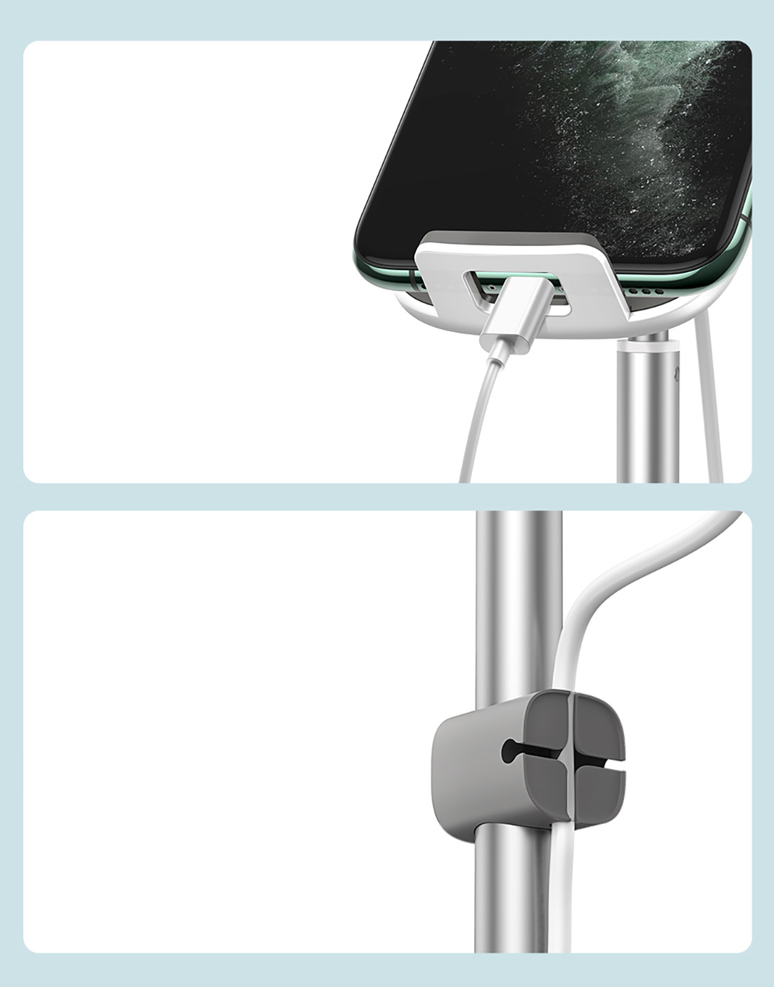 The Baseus stand is distinguished by its extremely well thought-out design. These elements of the device, with which the phone is in contact, are covered with silicone providing increased protection against falling out. Aluminum stand covered with fire resistant ABS plastic and equipped with silicone feet guarantees stability even when the smartphone vibrates or when you set the height of the stand. The device is also equipped with holes for plugs and headphones, as well as a special clip for cables to increase comfort and safety.