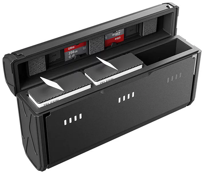 Nabíjačka Telesin sa vyznačuje jedinečným dizajnom podobným puzdru. Vďaka tomu je zariadenie mimoriadne praktické a jeho preprava bezproblémová - môžete ho pohodlne uložiť do tašky alebo dokonca do vrecka. Okrem toho nabíjačka ponúka priestor pre 2 pamäťové karty TF. Výsledkom je, že výrobok Telesin je funkčný nielen pri nabíjaní batérií, ale umožňuje aj pohodlné uloženie príslušenstva. Je to ideálne riešenie pre cestovateľov a aktívnych filmárov, ktorí si cenia poriadok a mobilitu.