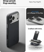 Charakteristickým znakom série Nano Pop je kontrastný farebný akcent okolo modulu fotoaparátu, ktorý dodáva moderný a dynamický vzhľad. Vďaka zabudovanému magnetickému krúžku zaručuje príslušenstvo plnú kompatibilitu s nabíjačkami a príslušenstvom MagSafe a ponúka rýchle a stabilné upevnenie bez posunu.