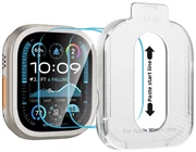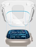 3) Priložte montážny rám so sklom k obrazovke hodiniek - sklo bude dokonale vycentrované. Odstráňte ochrannú fóliu z hornej časti skla a potom prstom stlačte sklo v strede obrazovky, aby sa začal proces priľnutia.