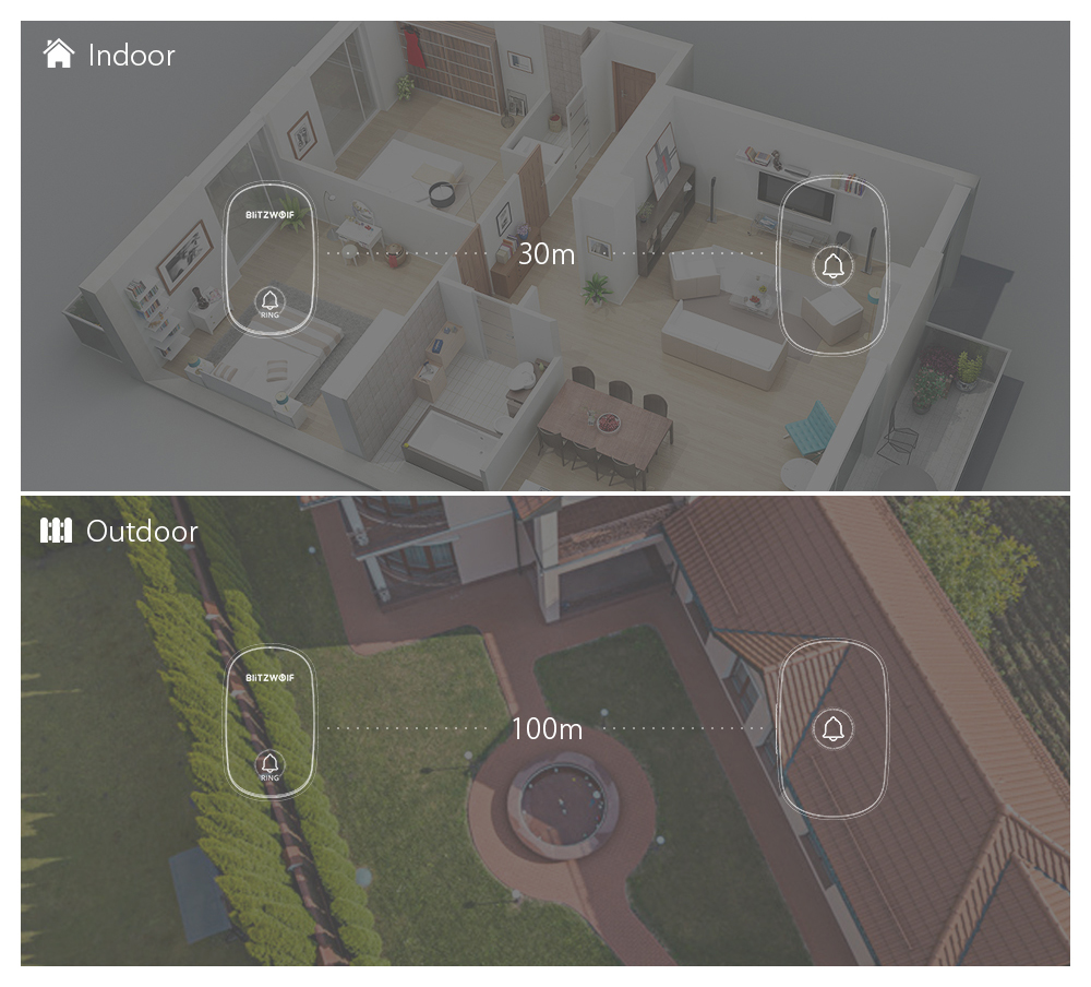 With a strong and stable signal, the bell is able to operate at distances of up to 100 m in the open air and up to 30 m indoors.