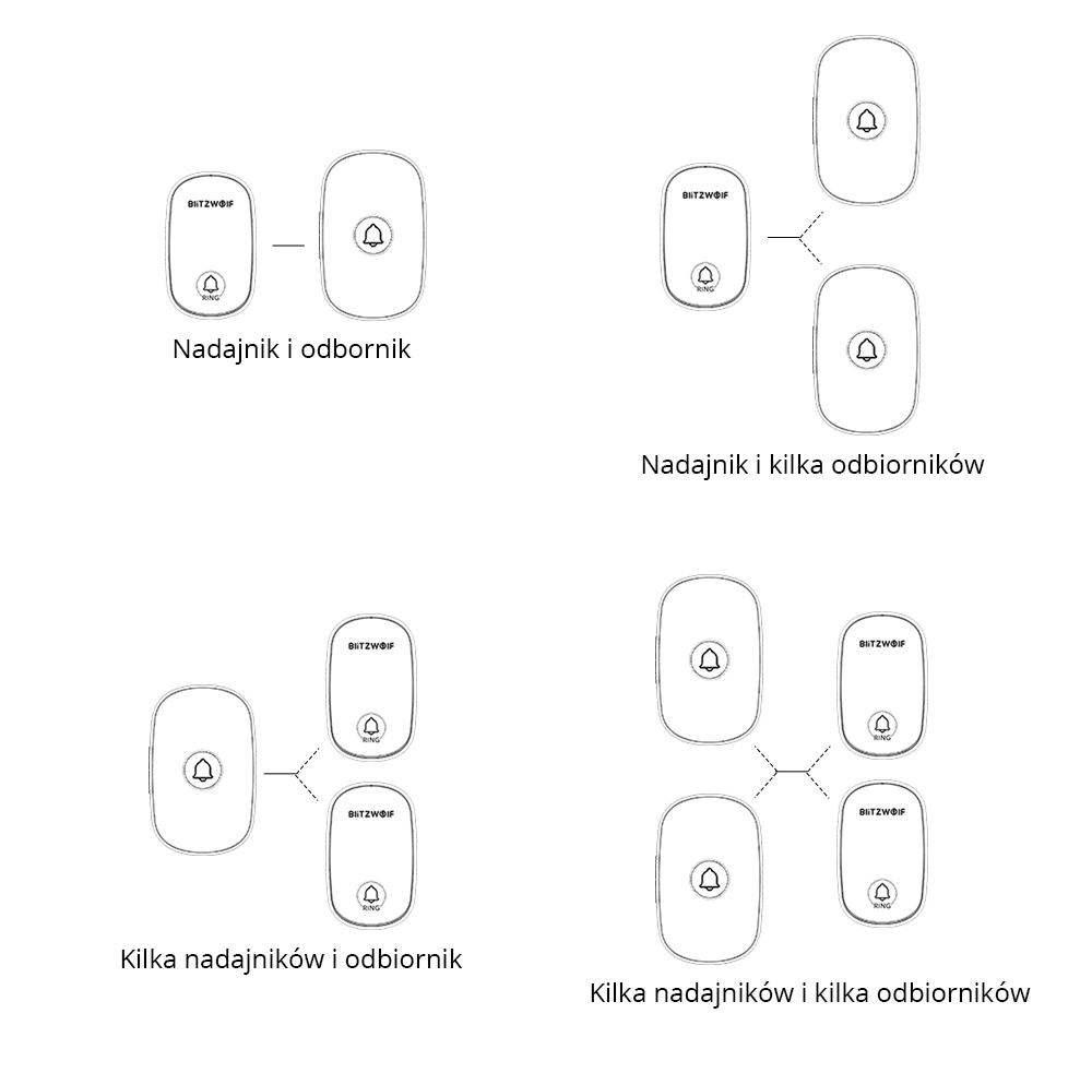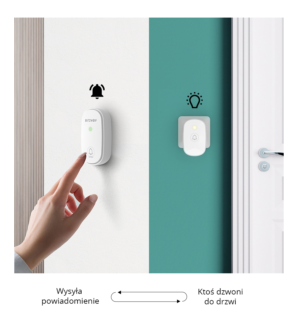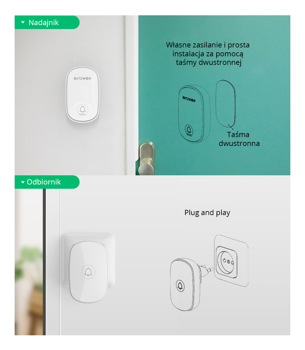 The bell is wireless and its installation is extremely quick and easy. The transmitter should be placed in a place of your choice, it has its own power supply so it does not need any batteries or other additional power supply. The receiver must be connected to the power supply in a place of our choice.