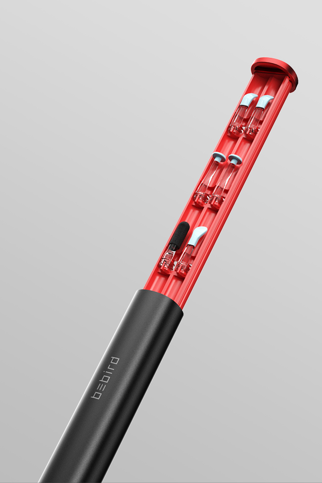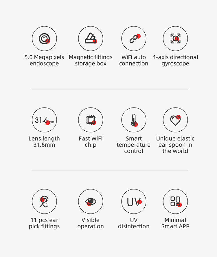 The classic version makes an amazing impression with its slender and smoothness. At the same time, it offers many cleverly concealed functions. For example, the interchangeable tips are hidden throughout the device. To pull them out, simply pull out the lower case. This allows you to change them whenever you want, no matter where you go. Each part is reusable, easy to disinfect and wash. The set includes 21 pieces. In the otoscope casing you will keep 4 classic tips, 5 for cleaning, but also for massage and one pair with rounded shape, suitable for deeper cleaning. It is available in two elegant colors. Both black and silver match perfectly with the red details.