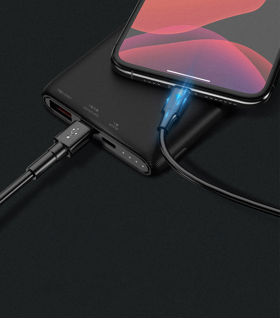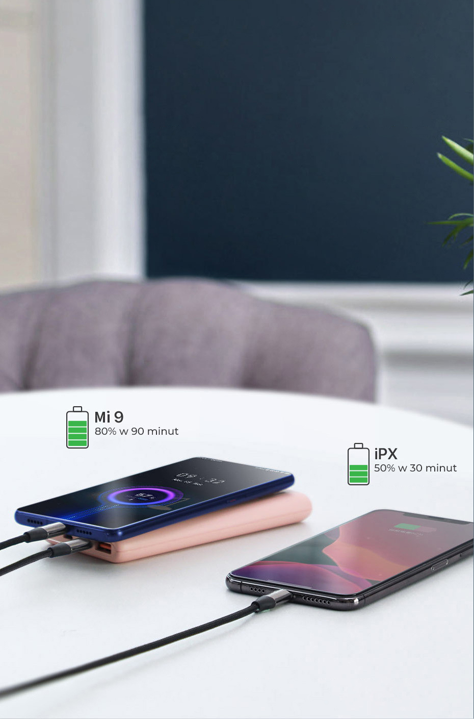 Baseus power bank is extremely light and compact. Due to the fact that its appearance and size resembles a smartphone, you can always have it with you, without any problem it will fit in a small bag or backpack. With it always with you, you can completely forget about it.