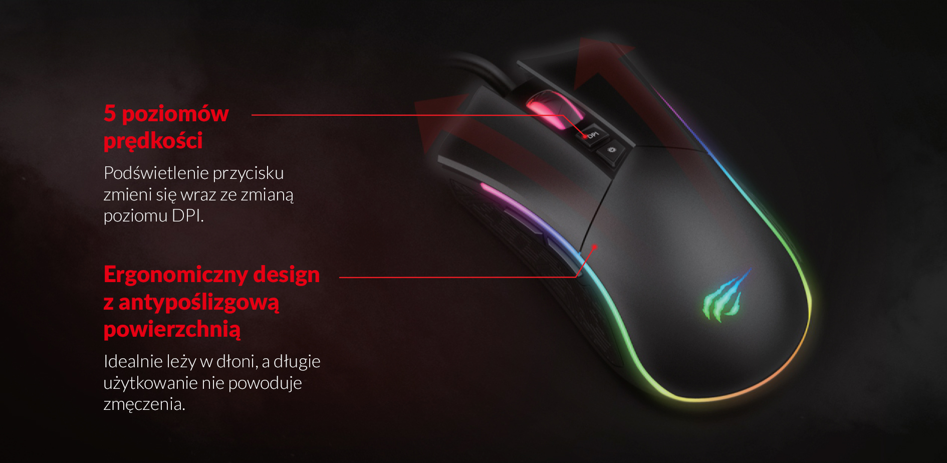 It has 5 levels of speed with which you can adjust the sensitivity of the mouse according to your preferences. You can see the change of DPI level by highlighting the button. This allows you to adjust the sensitivity of the mouse movements to a given situation and game.