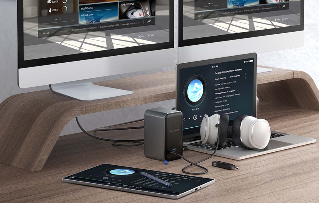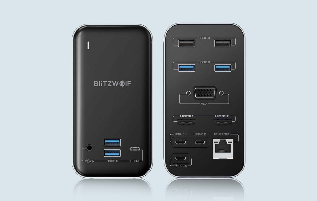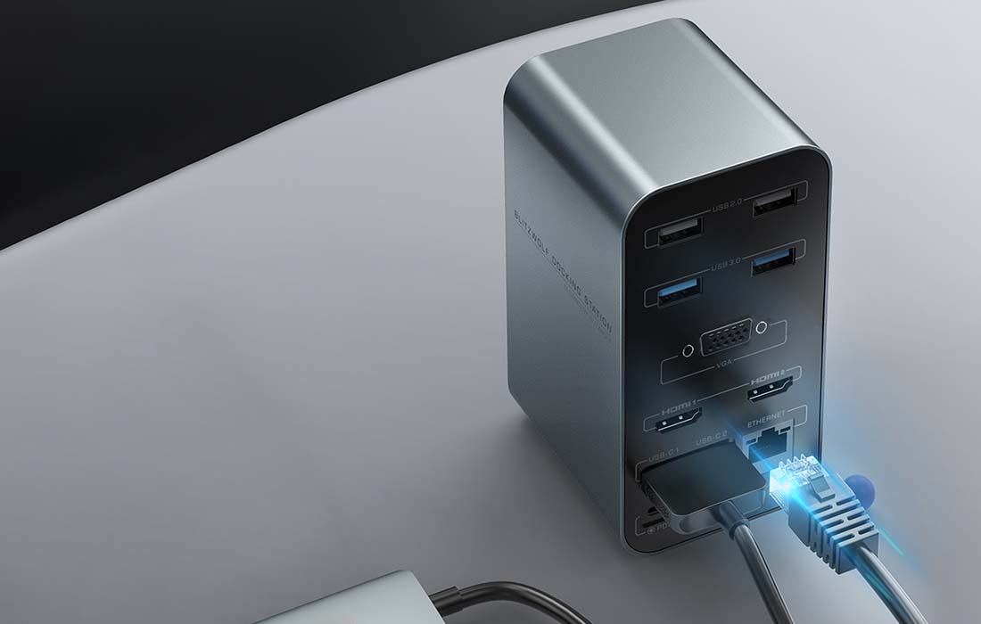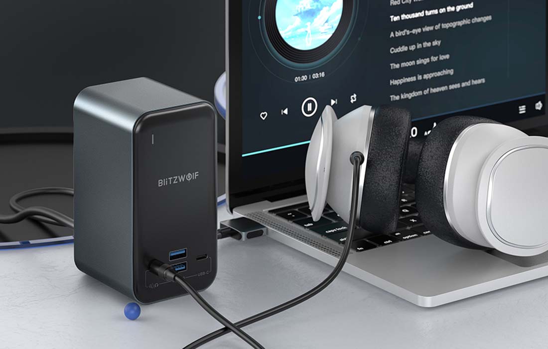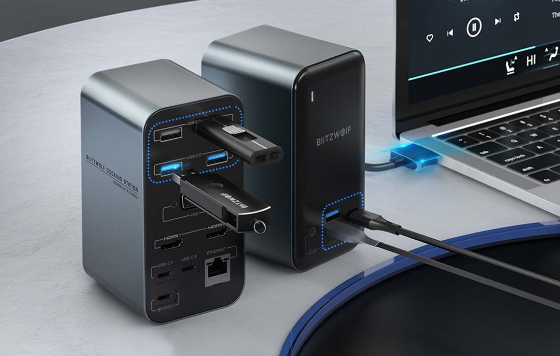 Dokovacia stanica Blitzwolf ponúka maximálne zvýšenie vašej produktivity a vyzerá dobre. Vďaka kompatibilite s viacerými zariadeniami súčasne umožňuje uvoľniť miesto na stole alebo vo vašom pracovnom priestore. Obraz je možné zobraziť na 3 obrazovkách súčasne v kvalite 4K. Navyše porty USB umožňujú prenášať dáta rýchlosťou 5 GB za sekundu. Verzia VGA je k dispozícii.